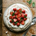 Letting the meringue cool gradually inside the oven prevents cracking and keeps the center marshmallow-soft while the outside stays crisp. The heavy cream, whipped and folded with finely chopped fresh mint leaves, sits on top like a cloud. The strawberries finish it with color and tartness that the sweet meringue needs.