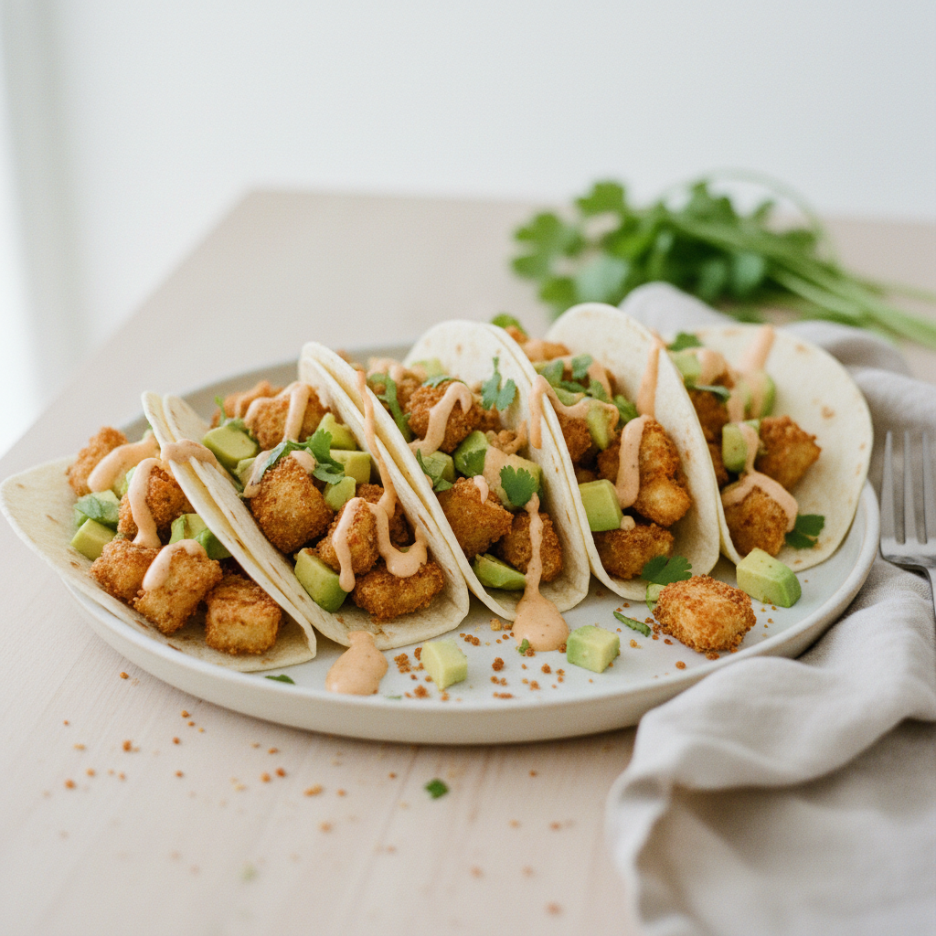 Crispy fried hearts of palm tacos with creamy avocado and cilantro. A fun vegetarian twist on a classic!