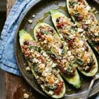 This Mediterranean version uses a filling of quinoa, sun-dried tomatoes, Kalamata olives. Feta, which gives you protein, salt, tang, and richness all in one scoop. The panko breadcrumb topping adds crunch that contrasts nicely with the soft zucchini underneath.