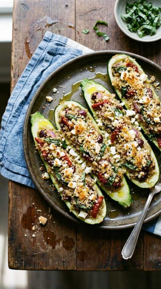 Stuffed zucchini boats are summer cooking at its most practical — take the vegetable that is taking over your garden, hollow it out, fill it with something savory, and bake until golden. These get a Mediterranean filling of quinoa, sun-dried tomatoes, olives, and feta that is bright, tangy, and hearty enough to make a full dinner. The zucchini shells soften in the oven while the filling stays textured, and the melted feta on top ties everything together.
