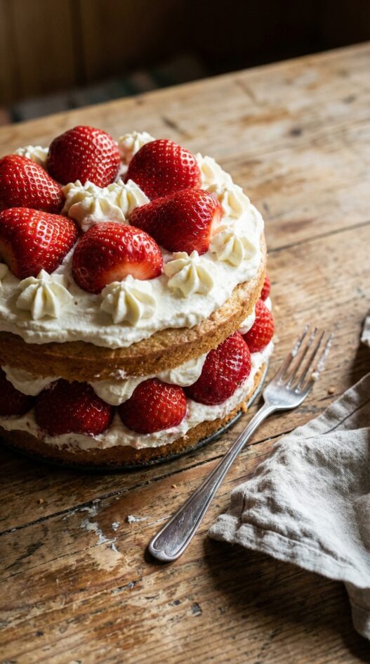 Light sponge cake layered with whipped cream and fresh strawberries. A delightful dessert for any occasion.
