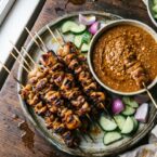 - Serve the satay hot with the peanut sauce, along with cucumber slices and onion wedges on the side.
