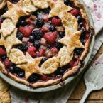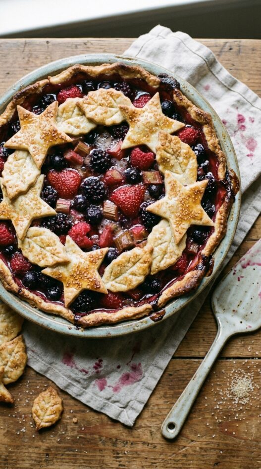 This gorgeous summer Bumbleberry Pie gets its sweet tart flavor from four kinds of berries plus a hint of rhubarb. Decorate the sweet with a simple star crust for a festive dessert.