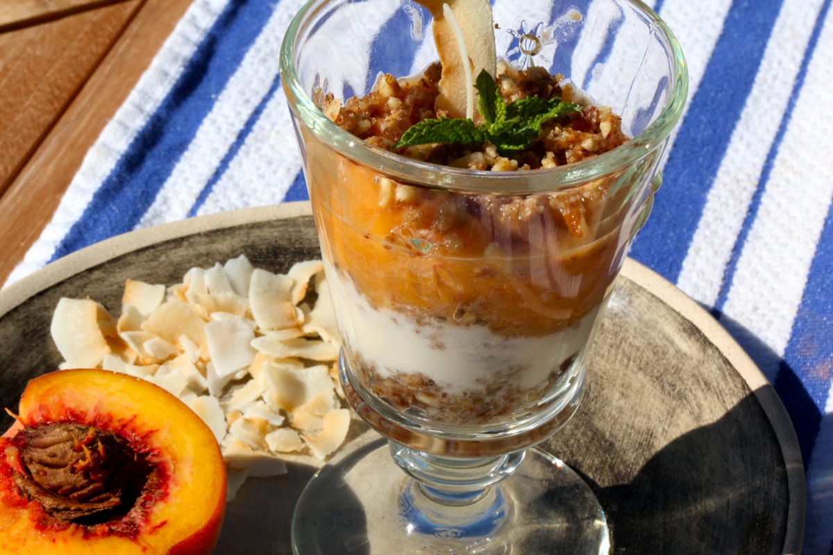 - To plate and serve, grab a parfait dish or glass mug. Begin by placing three tablespoons of pecan crumbs to bottom of dish, making sure the layer is even across. Next, add two tablespoons of yogurt, again making sure layer is even. Top this second layer with 2 tablespoons of pecan crumbs. Finish by adding three tablespoons of pureed peaches to top. Then garnish with sprinkles of pecan crumbs and coconut shreds if desired. Use same procedure to plate remaining parfait dishes. Enjoy immediately or chill for 15 minutes.