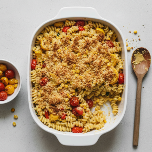 Creamy cheddar mac & cheese gets a summery upgrade with roasted corn, peppers, and squash. A crunchy panko topping adds the perfect finishing touch.