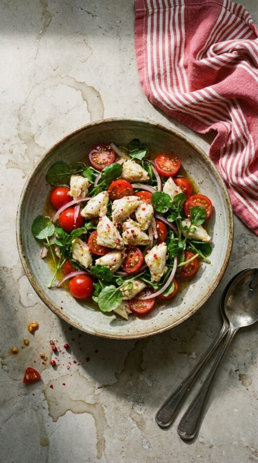 Sweet crab meat and juicy tomatoes mingle in a light, bright salad. Perfect for a summer lunch or light dinner.