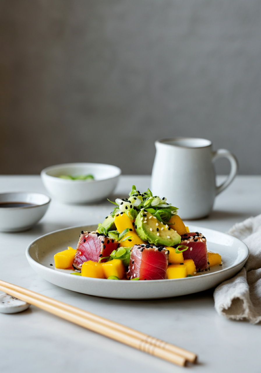 This protein packed dish is refreshing as a summer meal and includes sweet mango, creamy avocado, and crunchy macadamia nuts for the perfect flavors and textures to enhance the marinate ahi tuna.