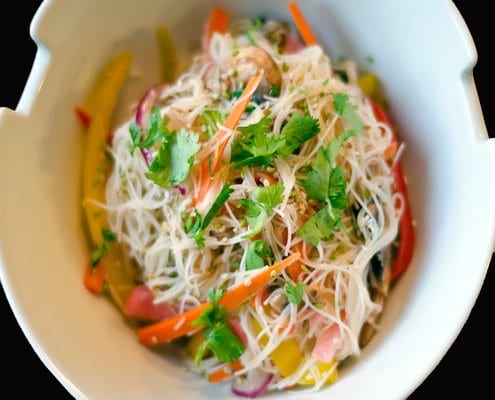 Cold rice noodles tossed with vibrant Asian vegetables and a light sesame oil dressing, perfect for a refreshing vegetarian meal.
