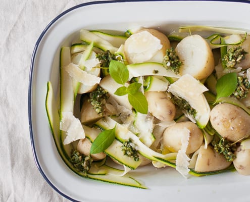 This summery salad combines boiled baby potatoes and raw zucchini ribbons with a fragrant basil pesto, topped with salty ricotta salata for a fresh and satisfying dish.
