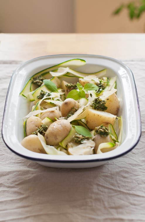 In this case, a classic pesto recipe becomes a great seasoning to a simple salad made with boiled new baby potatoes and raw zucchini ribbons –one of the best ways to enjoy very fresh zucchini. The combination of textures and flavors between sweet, soft potatoes, crisp zucchini, savory grassy pesto and some salty ricotta salata works just great, and results in a well balanced dish, filling yet fresh and light. Seasonal, healthy and satisfying.
