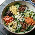 - Arrange the other toppings (corn kernels, cubed tomato, peeled and cubed cucumber, drained and halved artichoke hearts, grated carrots, black beans, crumbled feta cheese, and toasted pecans) over the spinach.