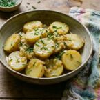 This is the biggest challenge here in the U.S. In Germany you can find potatoes that you simply cannot find here. Unlike Russet potatoes, for example, which are flaky, mealy, and generally flavorless, the kind used in potato salads in Germany are firm, deep yellow in color, buttery and flavorful. And they keep their shape well. The closest you can get to those here are Yukon Gold potatoes and those are the ones I recommend for this recipe. Also, be sure to boil the potatoes in their skins – don’t peel them first.