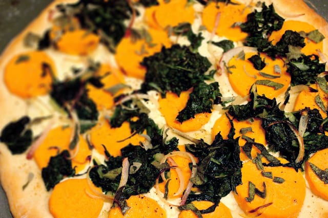 - On a floured surface, roll out the pizza dough with a floured rolling pin from the center outward. Feel free to make whatever 1/4-inch thick freeform shape you would like. Brush a baking sheet with EVOO (or feel free to use a pizza stone if you have one). Transfer the flattened dough to the oiled baking pan and brush the surface with 1 T EVOO. Scatter dollops of the ricotta atop the surface and spread with a spatula, leaving a 1-inch border for the crust. Evenly sprinkle the Parmigiano Reggiano cheese on top. Cover the cheeses with the sliced sweet potatoes, swiss chard, and sauteed red onions. Sprinkle with the chopped sage leaves, salt, pepper and a drizzle of EVOO. Bake for about 12-15 minutes, or until the crust is golden.