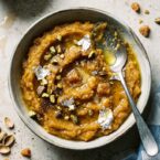 - Transfer the halwa to a serving dish, garnish with the remaining pistachios and silver warkh if using, and serve warm.