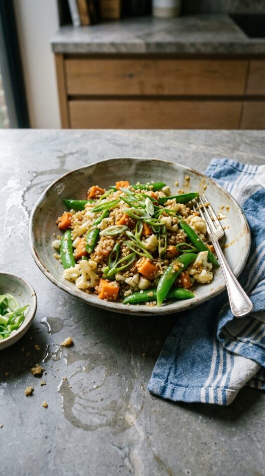 - Toss to evenly distribute dressing throughout veggies and quinoa.