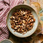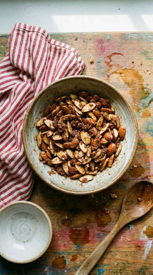 Ten minutes in the oven. That is all. Slivered almonds coated in maple syrup, brown sugar, cinnamon, ginger, and coarse sea salt come out lacquered and crunchy. They harden as they cool on the baking sheet. Keep a container of these on the counter and they disappear faster than any other snack in the house. Good in oatmeal too, or scattered over yogurt, but mostly just eaten by the handful before you get to any of that.