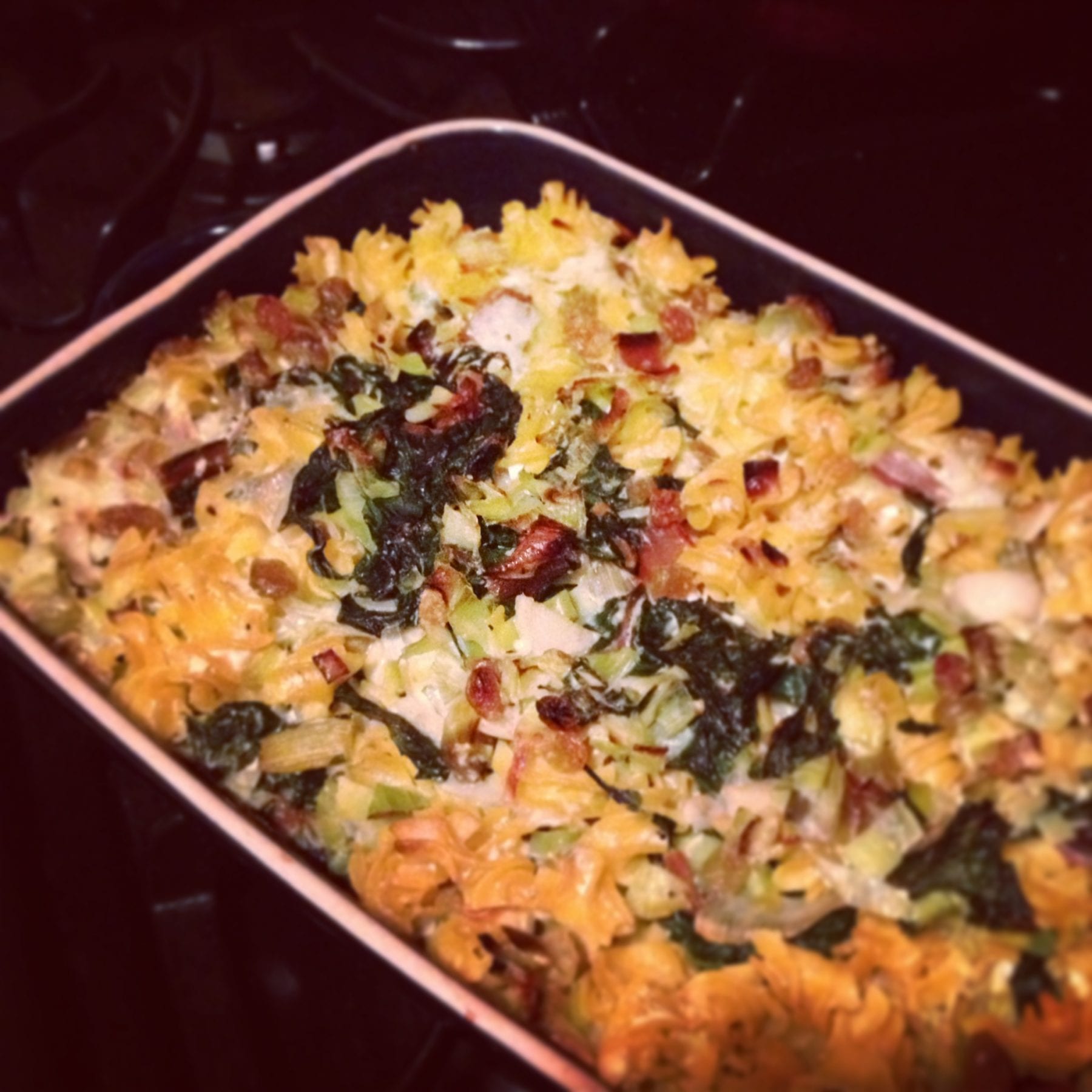 This dish references the sweet and cinnamon notes of your typical kugel, but adds leeks and swiss chard for a savory spin that is appropriate at any meal.
