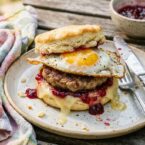 Dig into this flavorful sweet and spicy breakfast sandwich loaded with sausage, white cheddar, a fried egg, and raspberry preserves on a buttermilk biscuit.