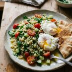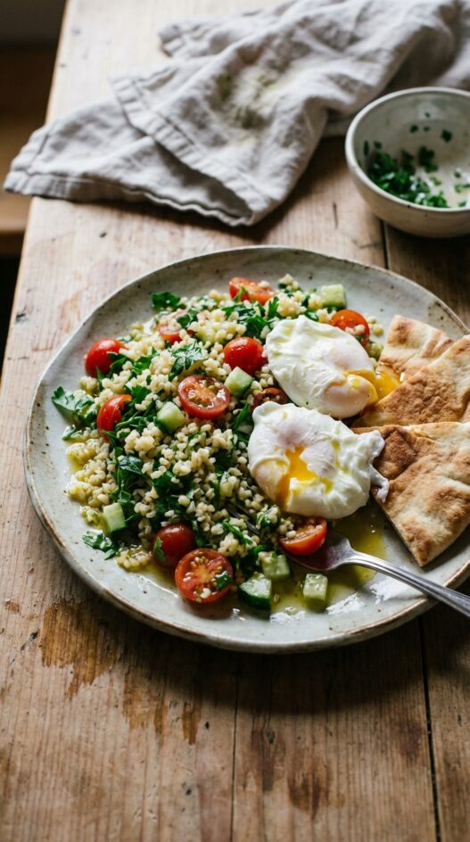 A vibrant Middle Eastern-inspired breakfast. Fluffy bulgur, fresh herbs, and perfectly poached eggs make this a delightful start to the day.