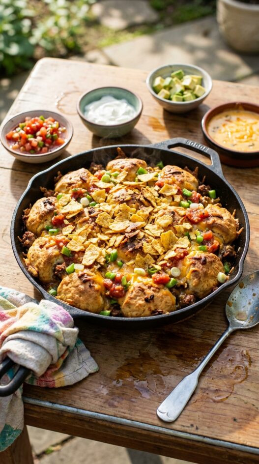 A fun twist on classic monkey bread! Savory taco filling baked into a pull-apart bread, perfect for parties.