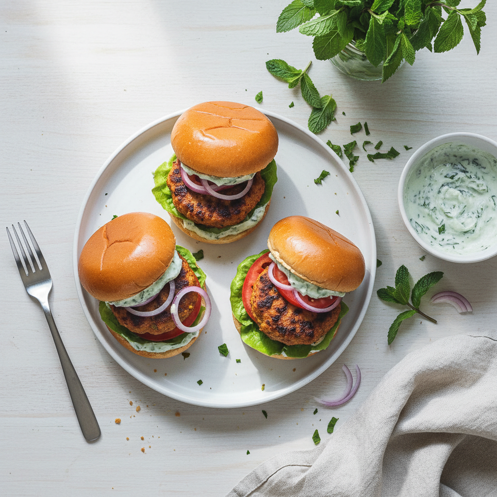 Flavorful grilled turkey patties seasoned with tandoori spices. Served on mini buns with a refreshing mint raita.