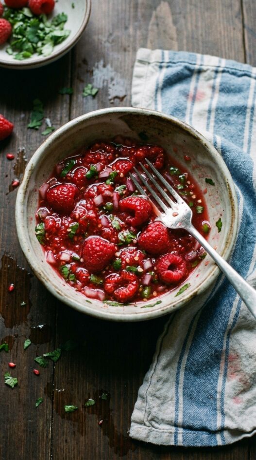 - Mash gently with a fork to release berry juices, leaving a few large pieces of raspberry in the salsa.