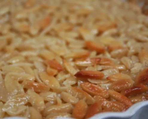 One of Portugal’s well-known legends tells of how almond trees came to be part of the landscape of the southern region when an Arab prince, concerned that his wife from a northern country, missed the snow so much she was depressed. The prince ordered the planting of almond trees, whose blossoming created the illusion of fields covered with snow. As to the validity of this romantic and highly lyrical legend, who cares?! The Portuguese love their almonds and this Tarte de Amendoa is simply sublime.