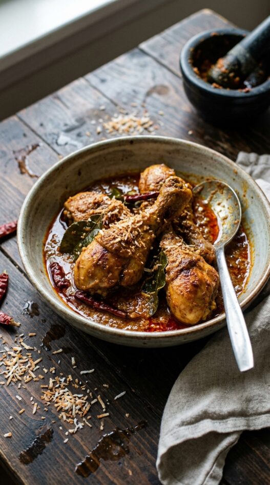 Rendang is a dry curry; the coconut milk and liquid cook down almost completely, leaving the chicken coated in a rich, concentrated spice paste rather than swimming in sauce.