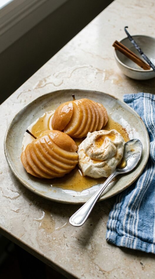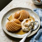 Elegant poached apples infused with black tea and white wine, topped with a luscious Calvados mascarpone cream. A divine winter dessert!