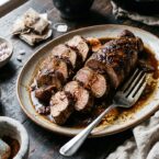 An elegant main course featuring a spice-rubbed pork tenderloin roasted to perfection. A unique pan sauce made with brewed tea and balsamic vinegar adds a sweet and tangy finish.