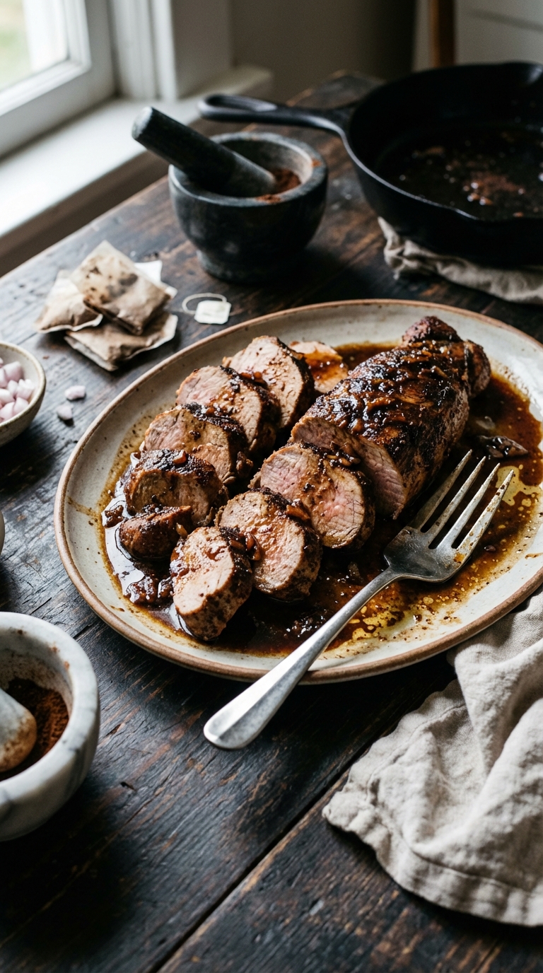 Marinate the pork overnight for best flavor. Use a meat thermometer to avoid overcooking. Let the meat rest to retain juices. Prepare the tea for the sauce in advance. Use a heavy pan for browning to enhance flavor.