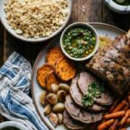 A tender leg of lamb slow-roasts to perfection, creating a fall-off-the-bone masterpiece. Serve with vibrant mint pesto and roasted vegetables for a satisfying meal.