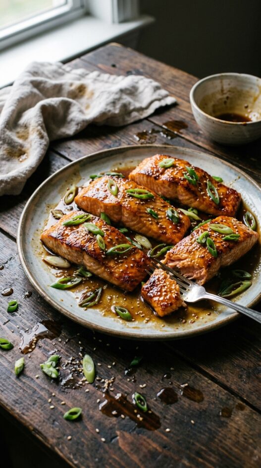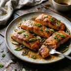 Pan-fried salmon with a homemade teriyaki glaze. Serve it with rice and your favorite veggies for a complete meal.