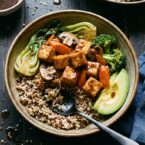 These tofu teriyaki quinoa bowls start with a base of quinoa and brown rice, are topped with a delicious combination of veggies (carrots, boy choy, mushrooms, and broccoli), and crowned with irresistibly crispy cubes of tofu and a few slices of avocado. It’s so good, satisfying, and the kind of meal you just feel GOOD about eating. Whole grains, saucy veggies, protein-packed tofu, and all-natural fats from the avocado to round it out. I seriously loved these!