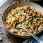You can use white or whole wheat spaghetti in this dish, and linguine or even fettuccine also work well. I like to top things off with some chopped fresh tomatoes and cilantro.