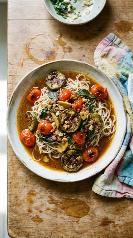 Thai eggplants are genuinely fun to cook with. They’re smaller and firmer than the usual kind, and they hold up in a hot wok without going to mush. This stir-fry gets fish sauce, black vinegar, palm sugar, and sambal into the pan together, and the result is sharp, a little smoky, a little sweet. Cherry tomatoes go in near the end so they blister but keep some bite. Thai purple basil finishes it. Fast to make, loud with flavor.