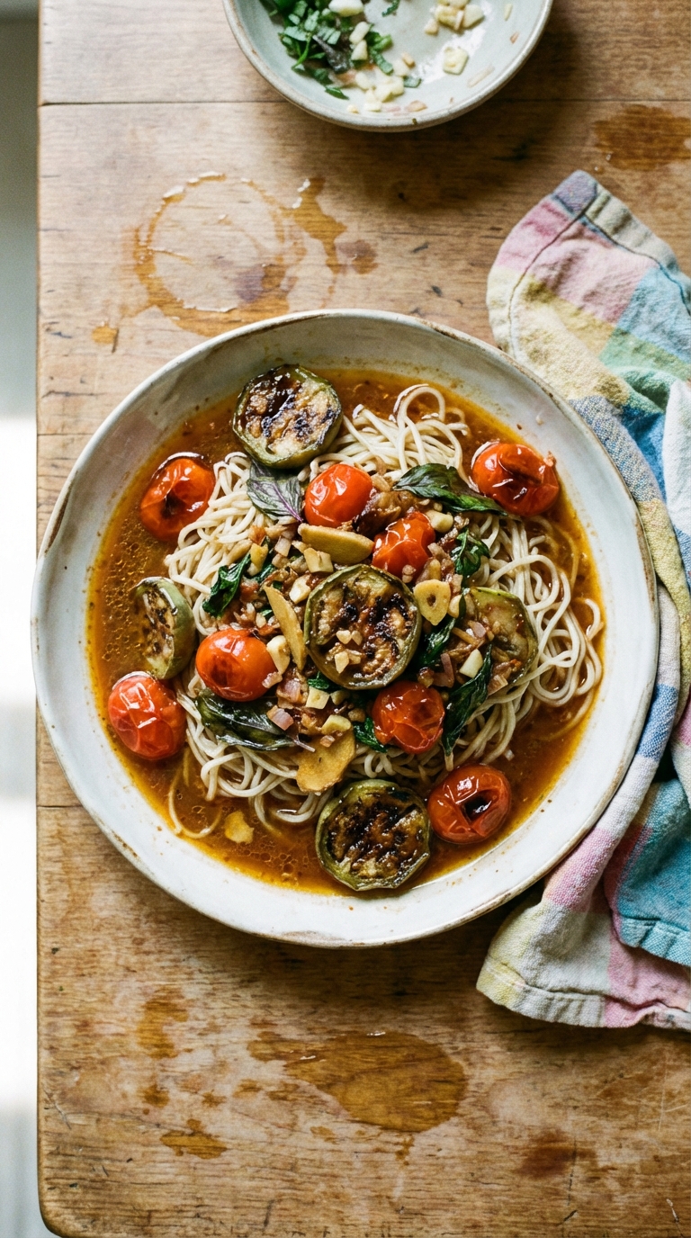 Sweet and savory stir-fry of Thai eggplants and cherry tomatoes, bursting with fresh Thai basil. A quick and vibrant side dish.