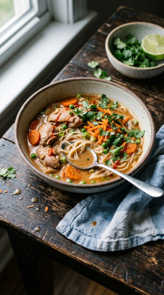 Rice noodles are the traditional choice. Flat rice noodles or thin rice vermicelli both work well. Cook them separately and add to each bowl so they do not get mushy sitting in the broth.