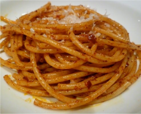 Most of the “authentic” versions of recipes with the AOP are a very simple pasta sauce, made by browning sliced garlic just ever so slightly in olive oil, adding hot red pepper flakes, turning off the heat and tossing it over pasta. This dish is so simple and quick, it hardly seems worth the even minimal effort of making a sauce like I saw in Bassano. But then I started to think about all the other uses for the AOP sauce, if it happened to live in my refrigerator for a week: