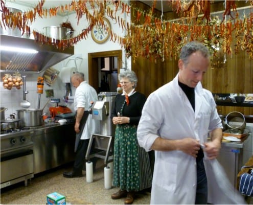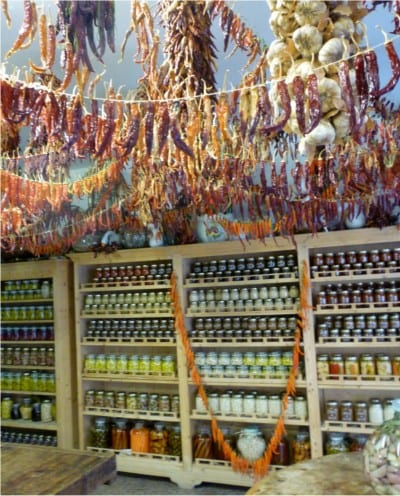 The name of this shop is “Specialita in Gamba”, and it advertises “Produzione propria e spaccio di conserve aglio e peperoncino”, conserves of garlic and peppers. Strings of garlic and dried hot peppers hang from every available rafter. They produce a wide variety of items packed in olive oil – garlic, both whole and crushed, shallots, as well as many pickled vegetables – carrots, cauliflower, peppers, celery. In addition, they produce and can many interesting sauces; cren in salsa (horseradish), radicchio, white asparagus, and one simply labeled AOP.