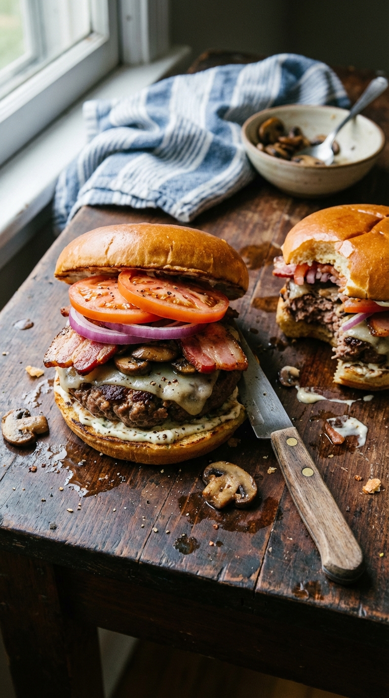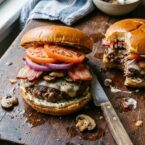 Ground brisket makes a better burger than most people realize. It has more fat marbling than standard chuck, and it stays juicy through the whole cook without any filler or binders. This recipe tops it with Swiss cheese, sauteed mushrooms, purple onion, heirloom tomato, and a horseradish mayo that cuts through the depth better than plain ketchup ever does. Thick bacon, one piece cut in half per patty. Eight burgers total from four pounds of meat. If you’re grilling for a crowd this summer, this is the right recipe to reach for. Season the meat lightly and mix it gently. Overworked ground meat gets dense and tight on the grill.