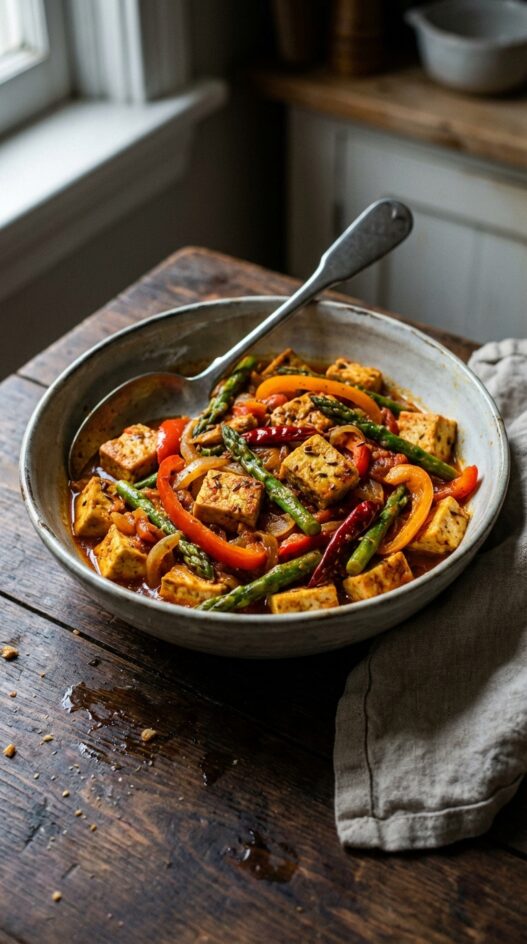 Crispy tofu and vibrant veggies tossed in a fragrant Indian-spiced sauce. A quick and flavorful weeknight meal.