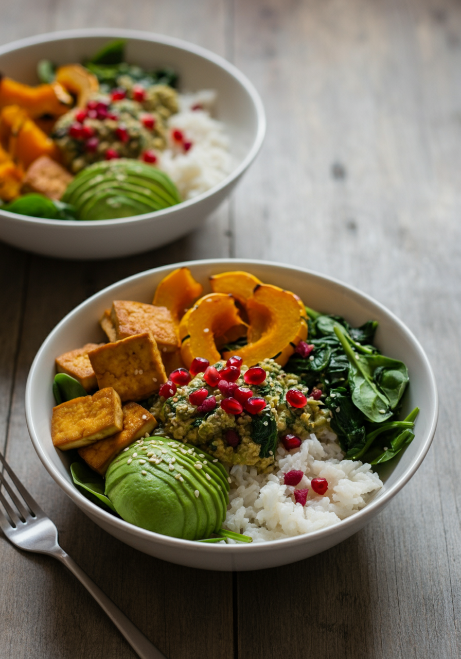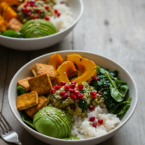 Hearty and healthy, this vibrant bowl is packed with roasted squash, crispy tofu, and pomegranate seeds. Perfect for a satisfying weeknight meal.