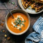 A bowl of tomato basil soup and a cornbread waffle grilled cheese is the perfect comforting meal. Warm, buttery cornbread waffles are stuffed with cheese and served with the creamiest tomato soup.