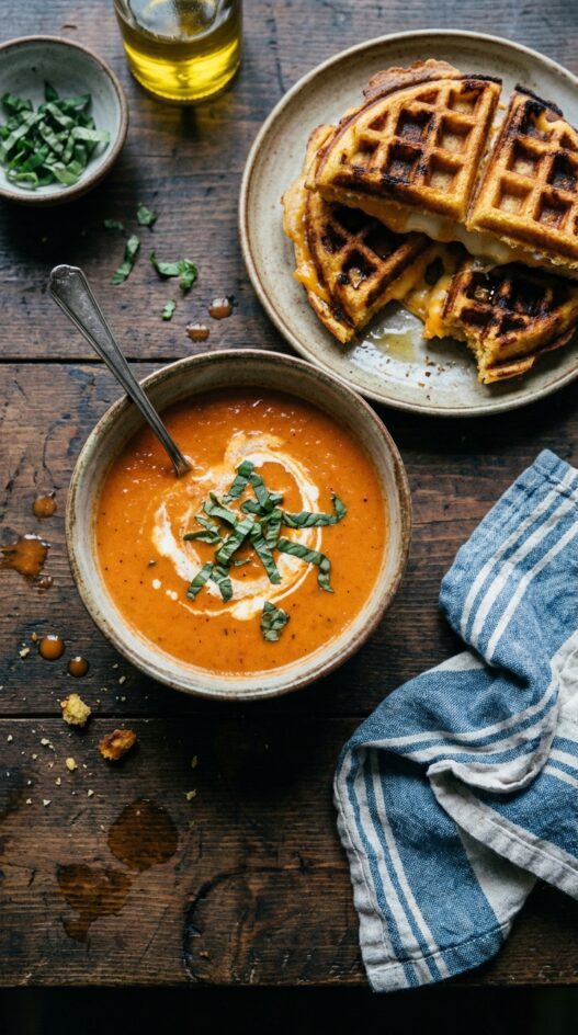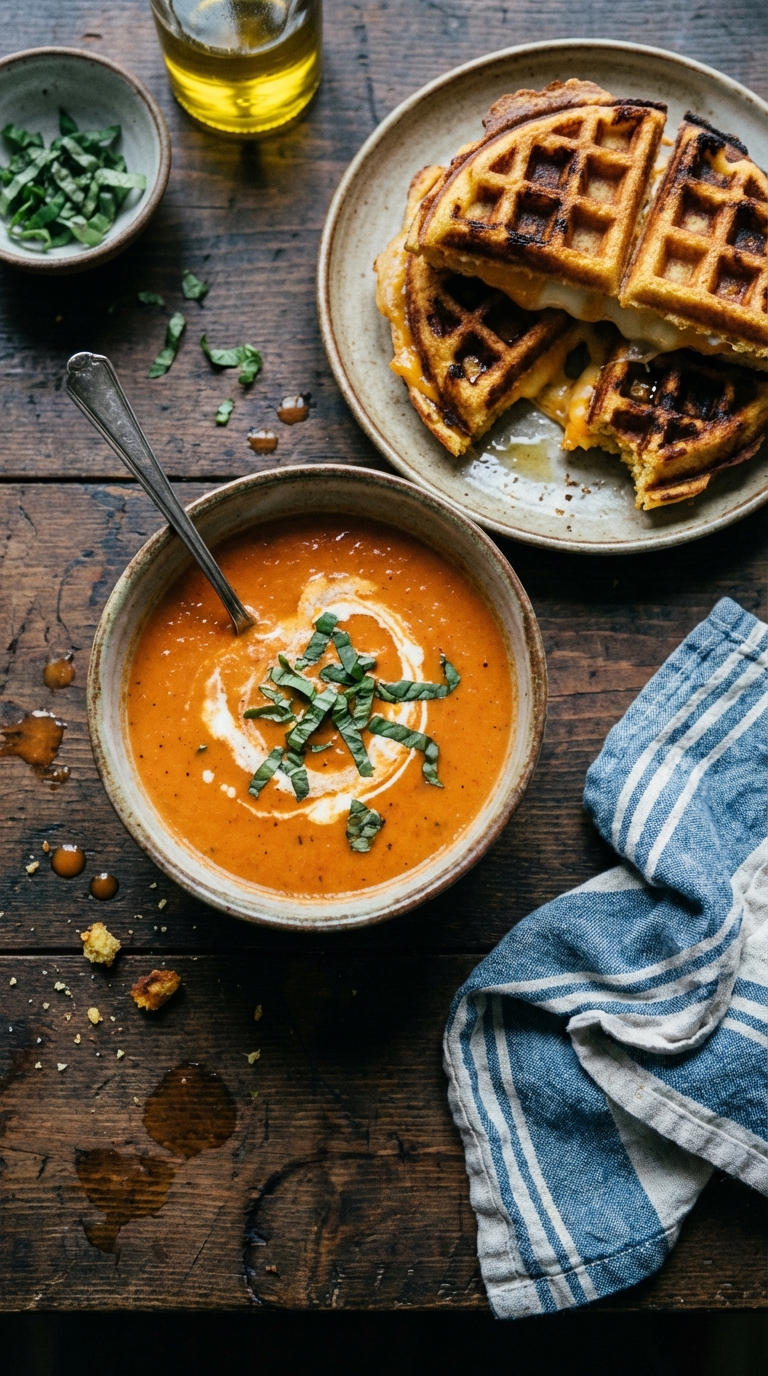 Tomato Soup with Cornbread Grilled Cheese Waffles