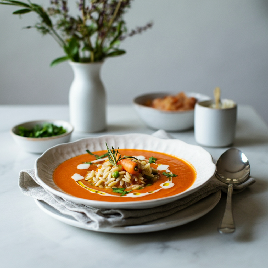 Hearty and comforting, this creamy tomato soup is elevated with orzo pasta and San Marzano tomatoes. Perfect for a chilly evening!