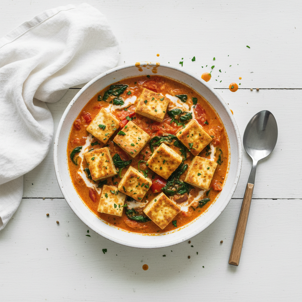 Dive into a bowl of tomato and spinach tofu curry, a warm and comforting dish that can be served with rice or naan.