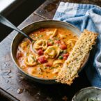 Hearty and creamy tomato soup with cheese tortellini and