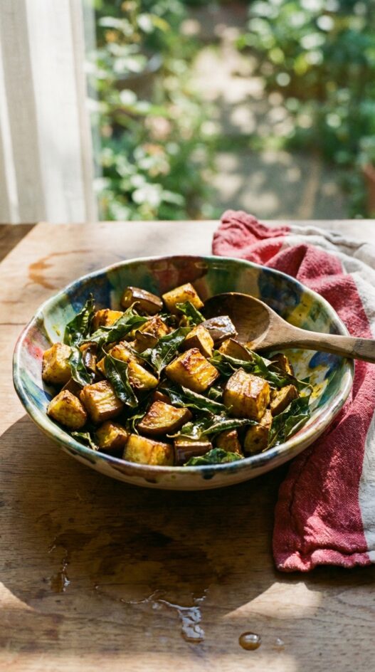 Crispy fried neem leaves and tender eggplant make a vibrant, flavorful side dish. Perfect with steamed rice!
