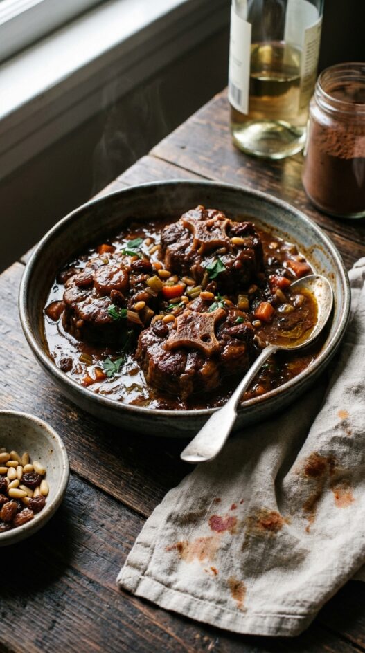 - Traditional Finish: For the traditional version, add boiled celery strips, cook 20 minutes, then add pine nuts, drained raisins, parsley, and cocoa to the sauce before returning the meat to the pan.